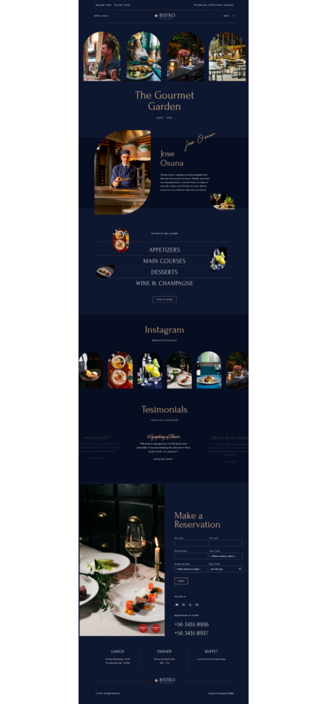 Pour maximiser la visibilité du restaurant sur les moteurs de recherche, nous avons intégré des stratégies SEO locales ciblant les mots-clés pertinents, comme “restaurant [ville]” et “réservation en ligne restaurant”. Les performances techniques ont également été optimisées pour garantir des temps de chargement rapides et une navigation sans accroc.